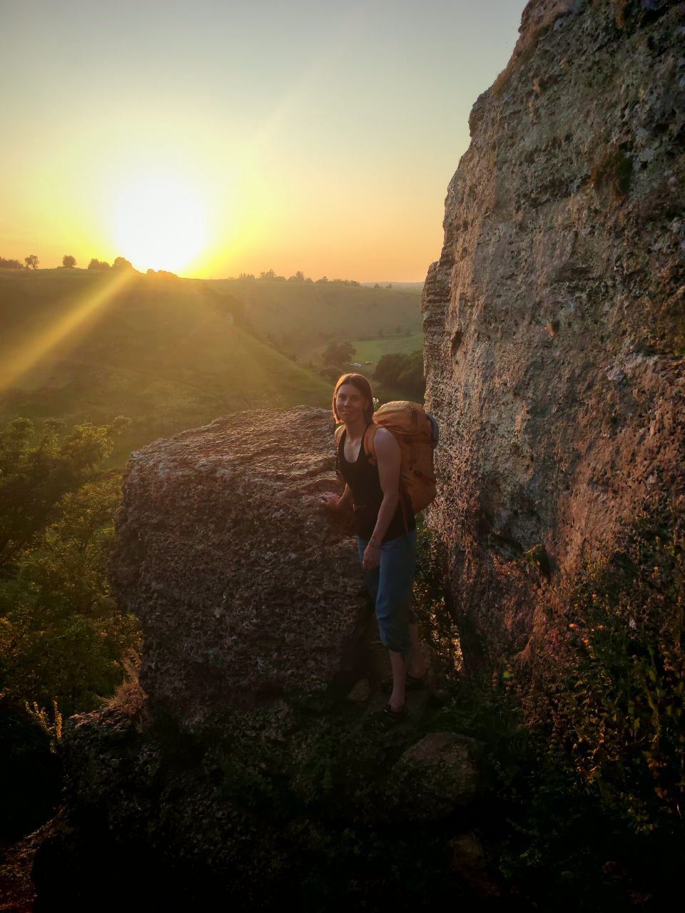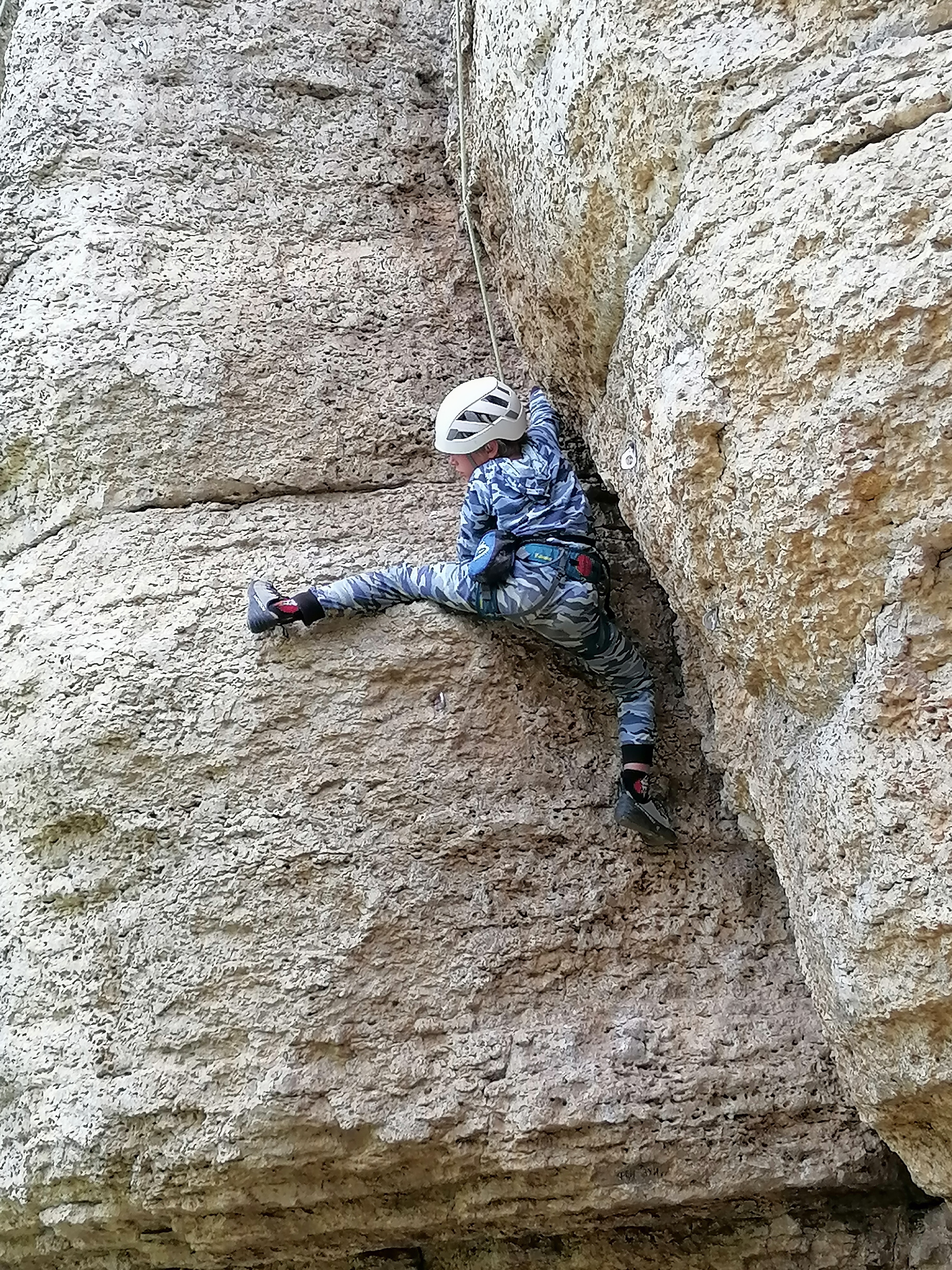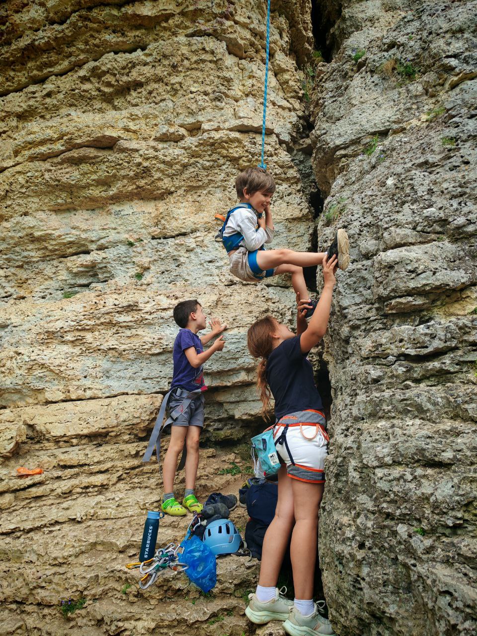 Скальная порода тёплого цвета, безопасные маршруты различных категорий сложности.